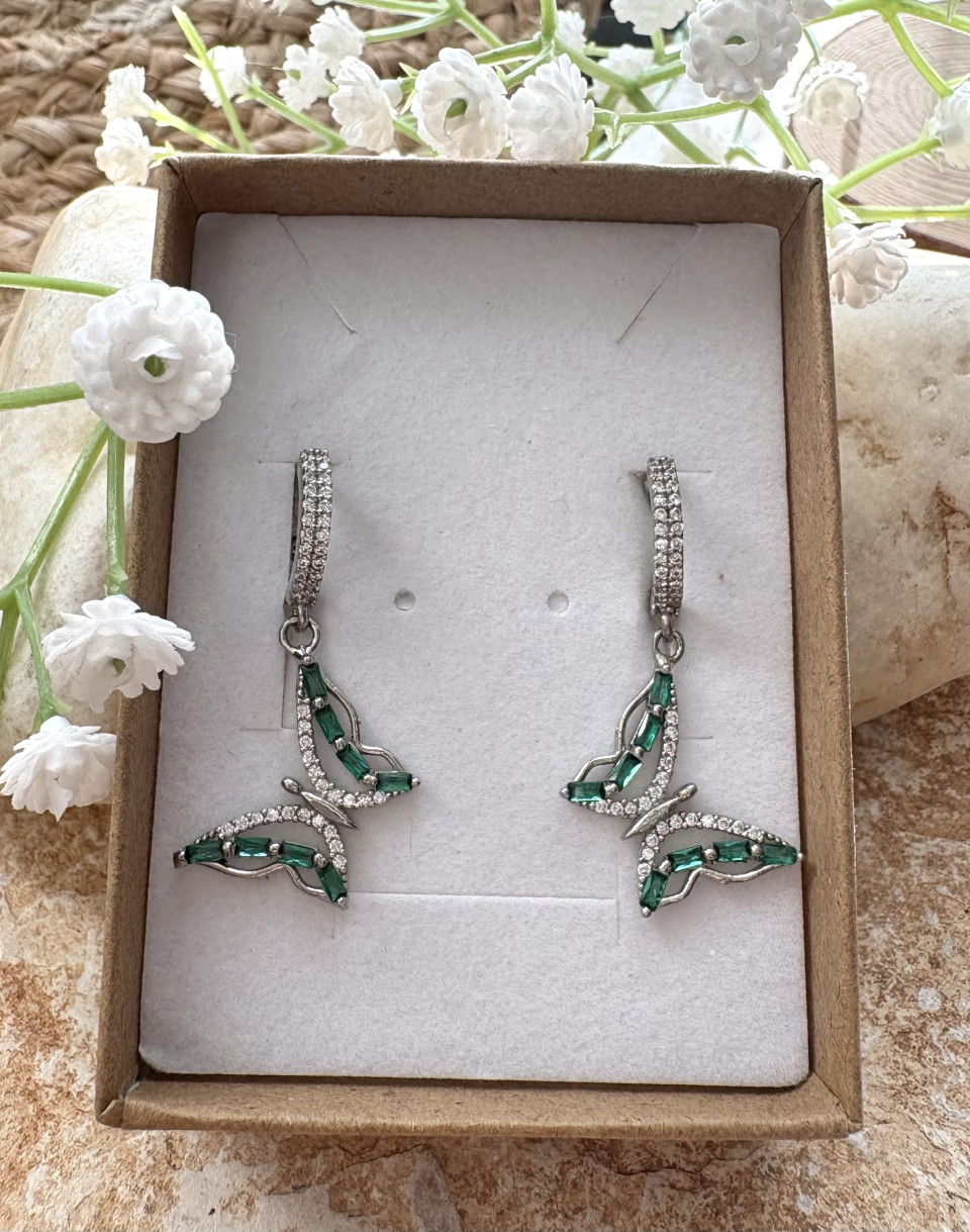 עגילי כסף 925 תליון פרפר משובץ בזרקונים  בגווני שקוף וירוק.