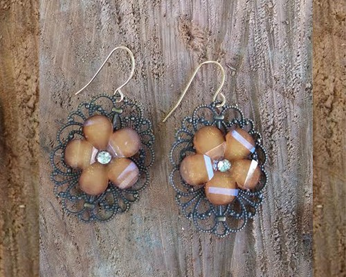 עגילי הוינטג' פרח בגוון חום בהיר נוצץ עם אבן משובצת