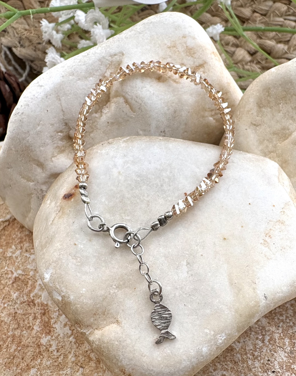 צמיד כסף 925 בשילוב סברובסקי קטנים בצבע שמפיין עם תליון דג נופל.