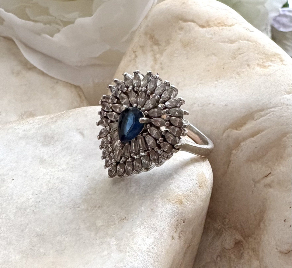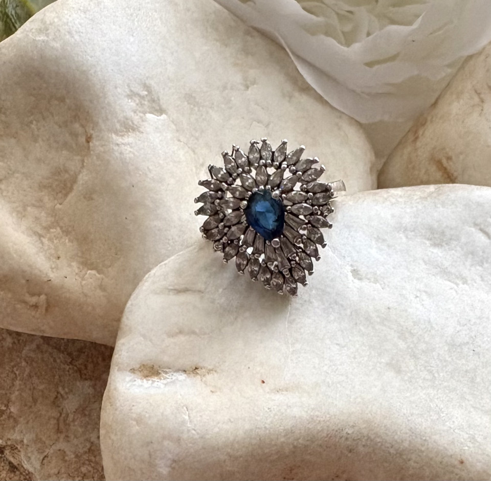 טבעת כסף 925 משובצת באבן זרקון כחול ובזרקונים שקופים.