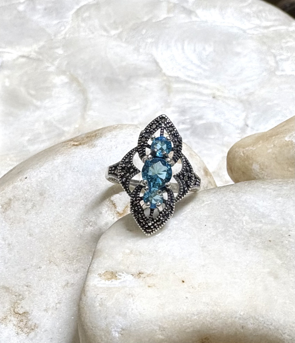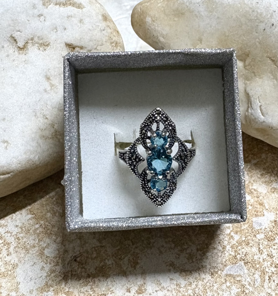 טבעת כסף 925 בשיבוץ זרקונים תכלת ומרקיזטים