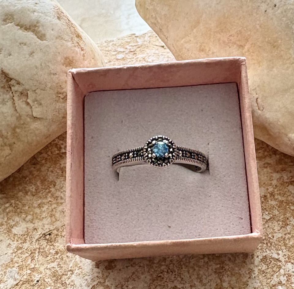 טבעת כסף 925 משובצת באבן בלו טופז ומרקיזטים.