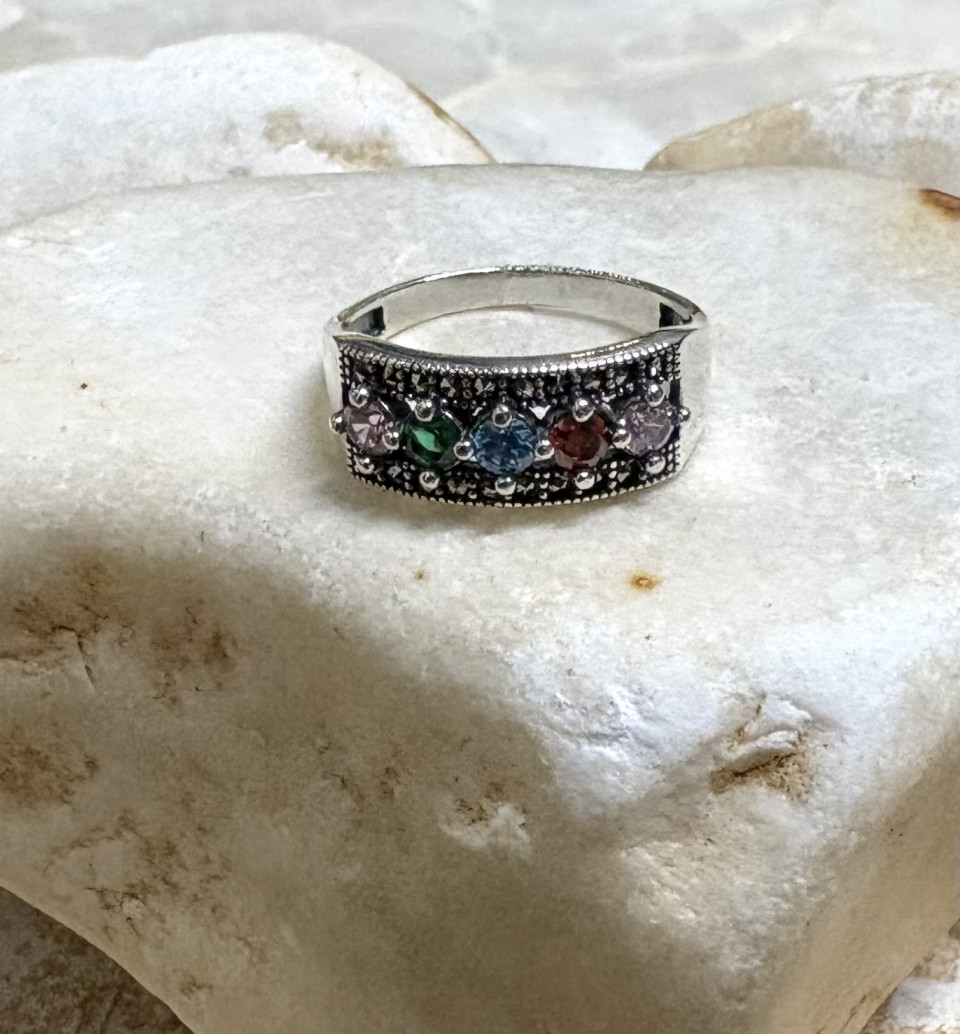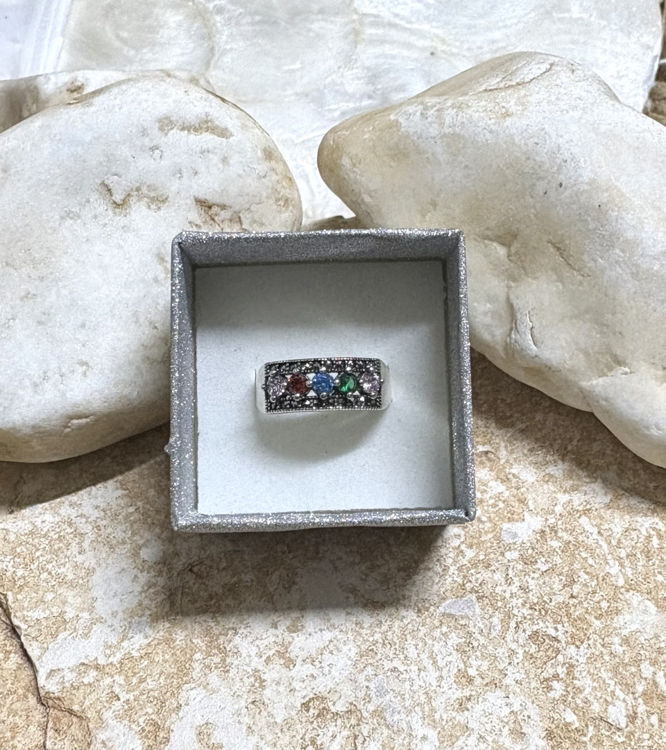 טבעת כסף 925 כתר בשיבוץ אבנים צבעוניות.