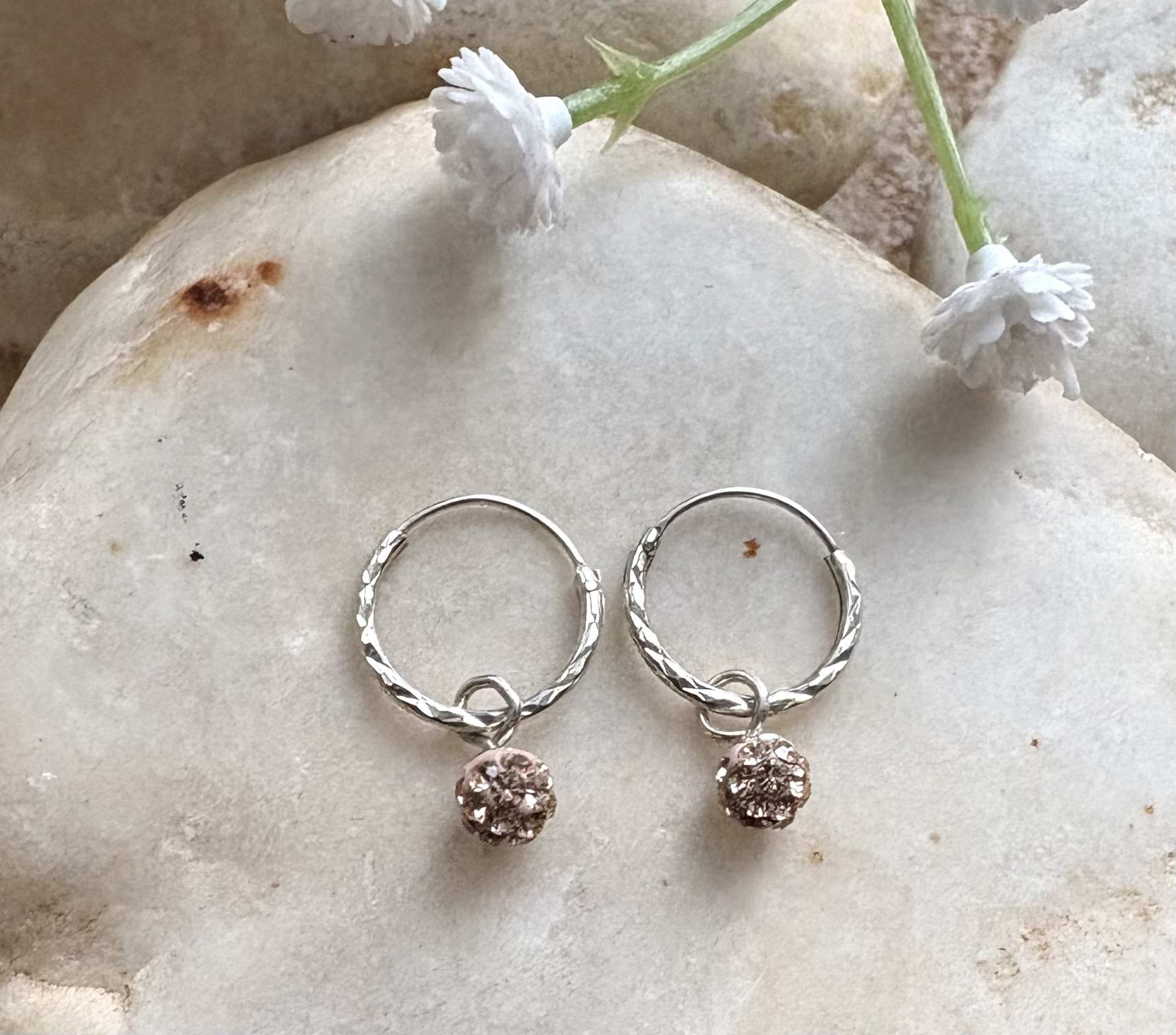 עגילי חישוק כסף 925 עם כדור משובץ באבנים בצבע שמפיין.