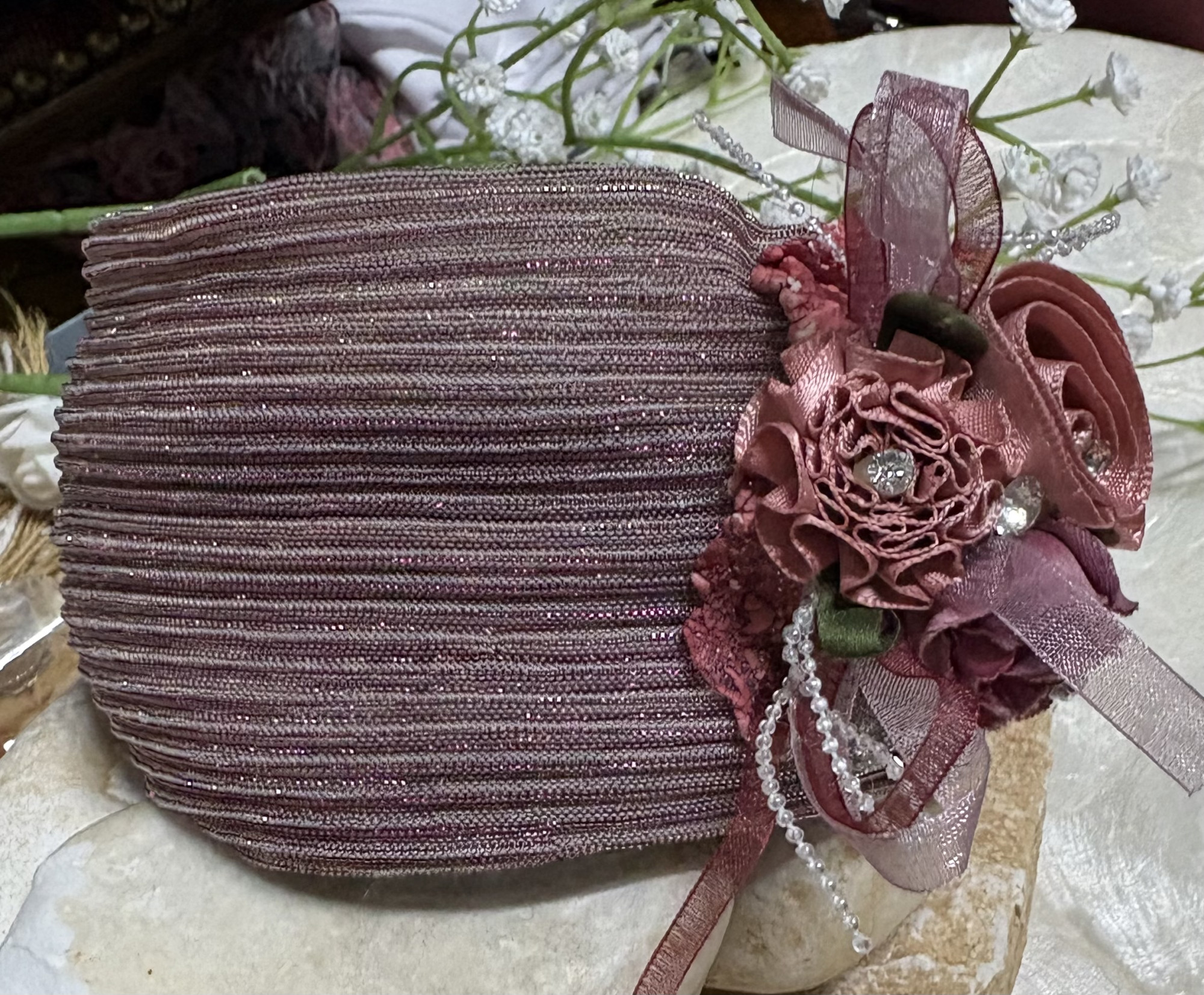 קשתות לשיער מעוצבת בגוון ורוד עתיק עם פרחים ואבנים משובצות.
