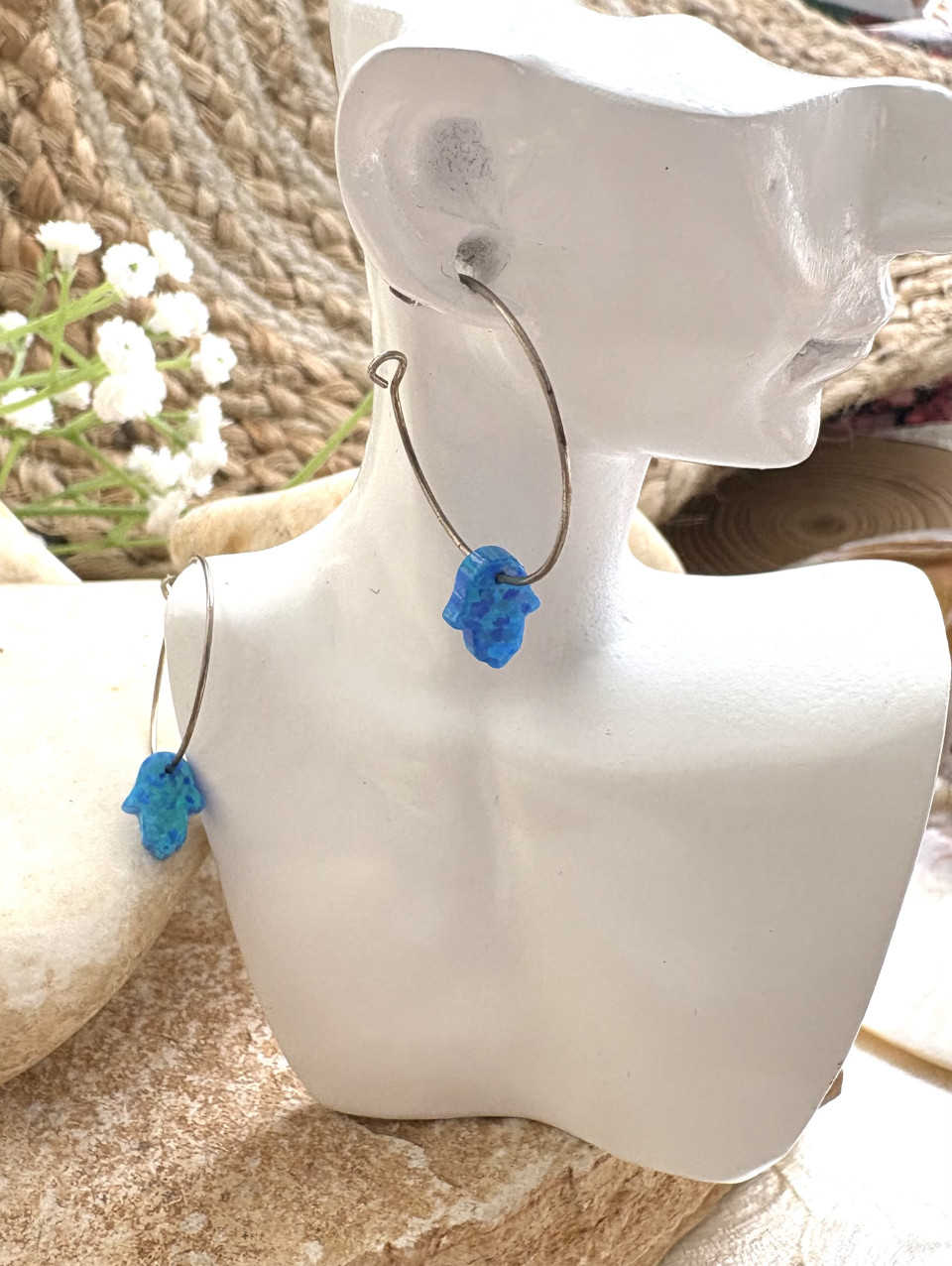 עגילי חישוק כסף 925 עם תליון נופל חמסה אופל כחול כהה.