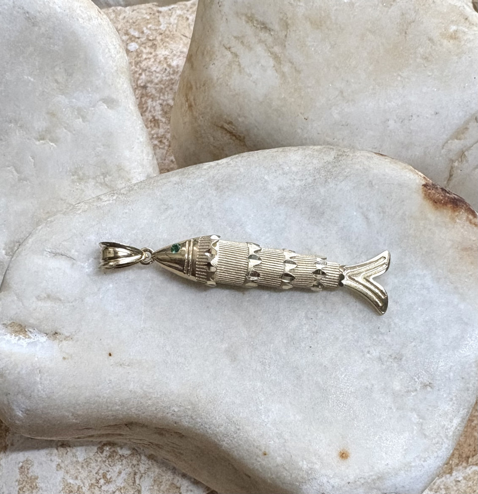תליון זהב 14K דגם דג,  עין ירוקה. חריטת לייזר