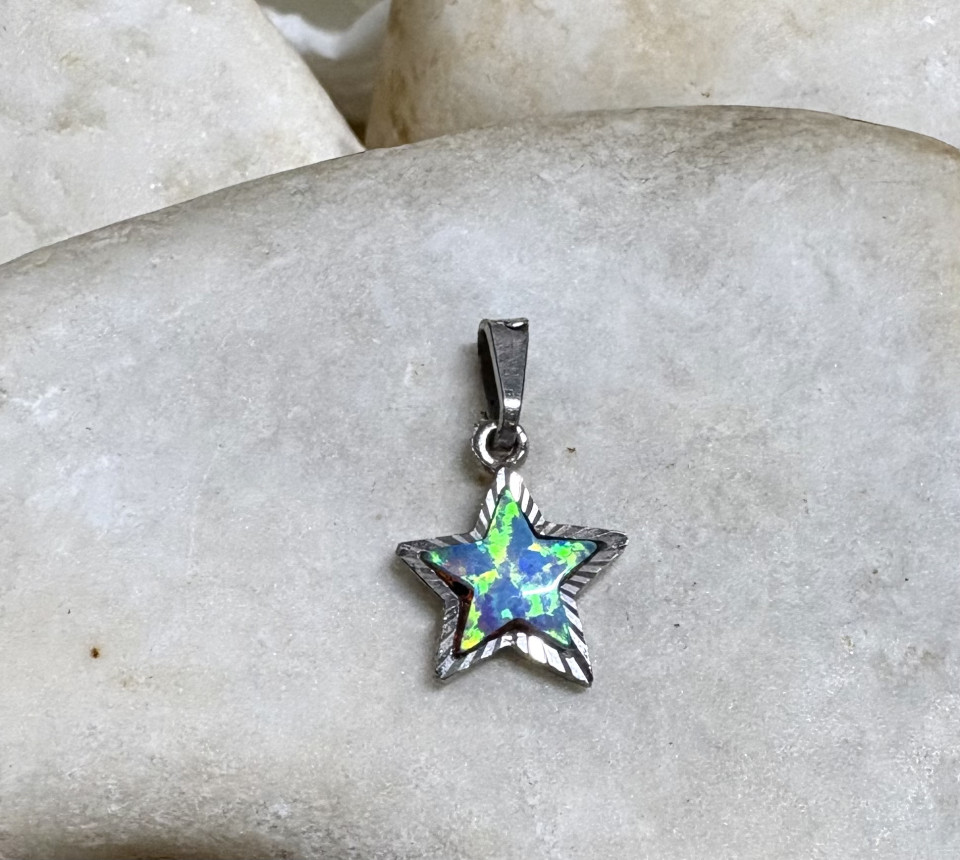 תליון זהב לבן 14K דגם כוכב בחריטת לייזר בשיבוץ אופל.