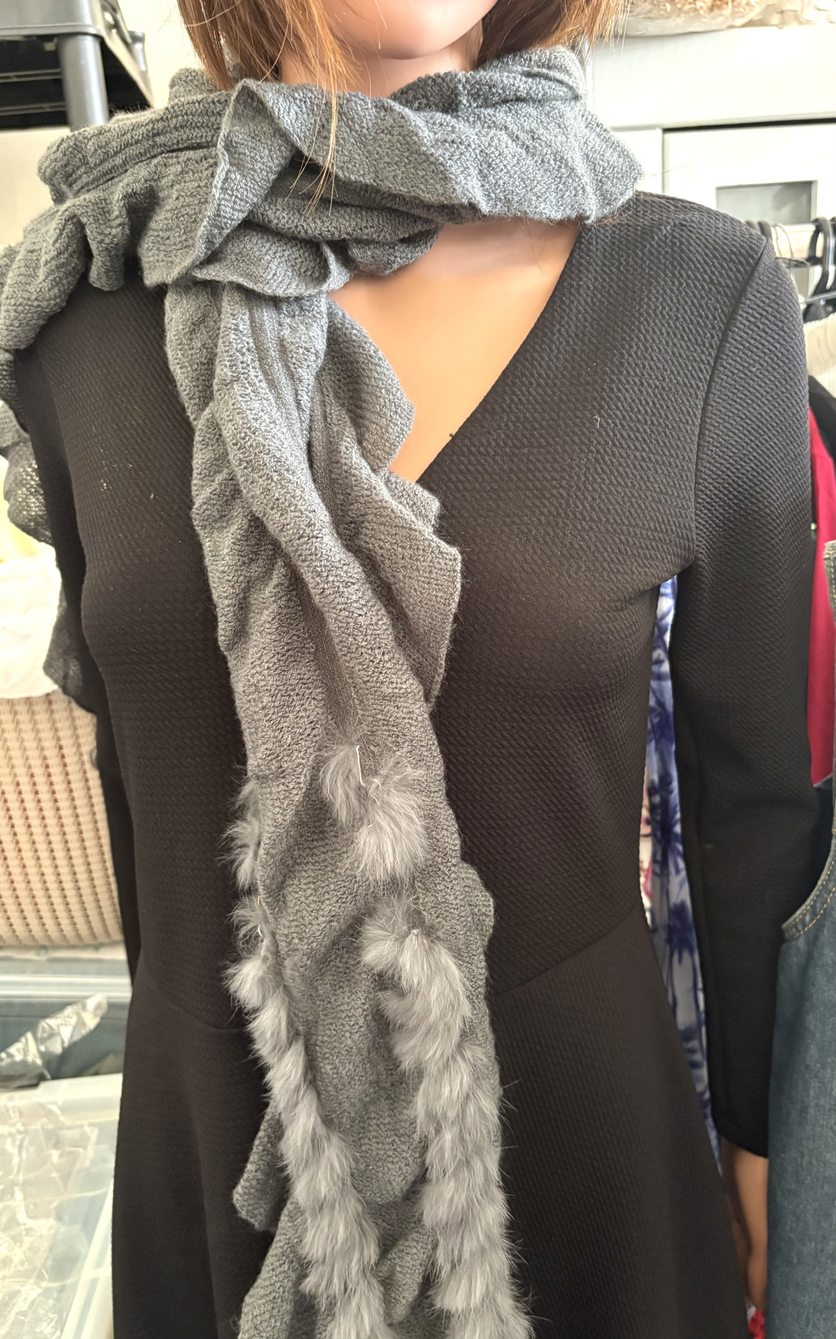 צעיף  ארוך לצוואר בצבע אפור עם פרווה שיוצאת מלמטה.