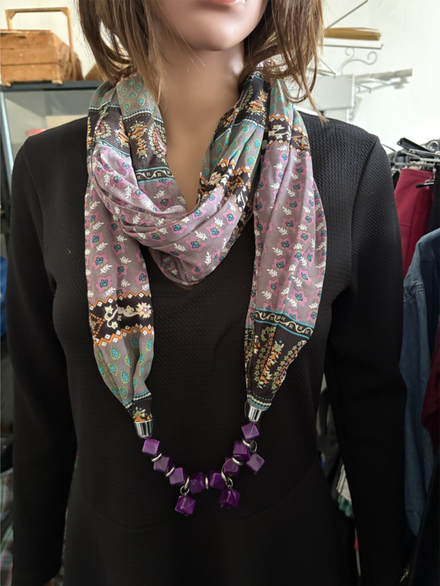 צעיף  לצוואר סגור בשילוב תכשיט שרשרת צבעוני וסגול.