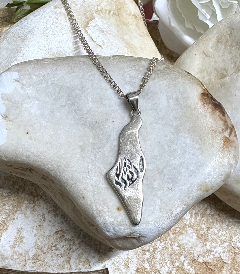 שרשרת כסף 925 עם מפת ארץ ישראל וחריטת האש שלי.