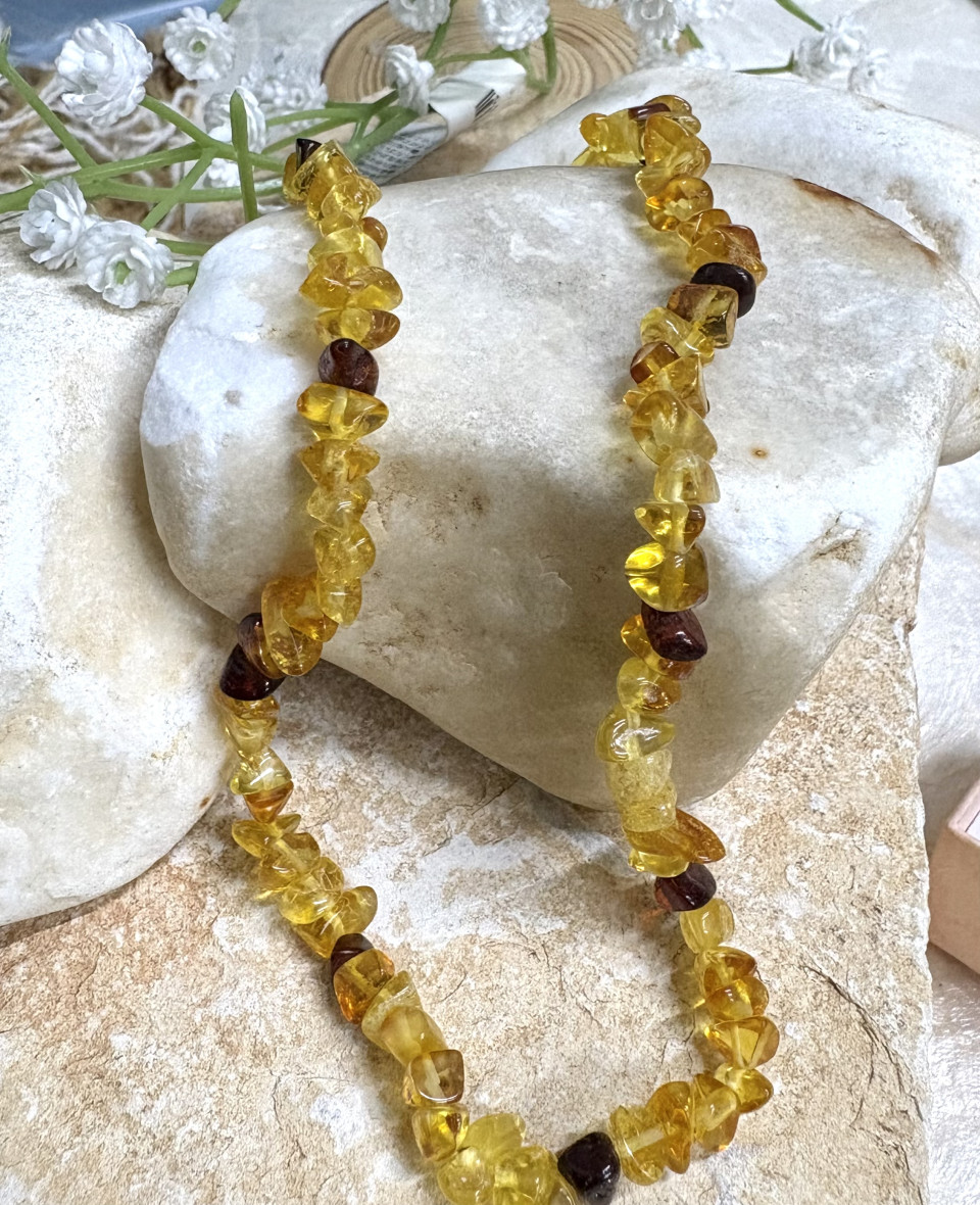 שרשרת אמבר,תסייע  בכאבי צמיחת שיניים,  דלקות שונות כמו אוזניים, דלקות פרקים, דלקות גרון,  חיזוק מערכת החיסון,  תחושת רוגע שלווה, יש הטוענים שענבר גורם לשינה נינוחה יותר,  איזון בלוטת התריס,  הקלה בכאבי ראש ומיגרנות.