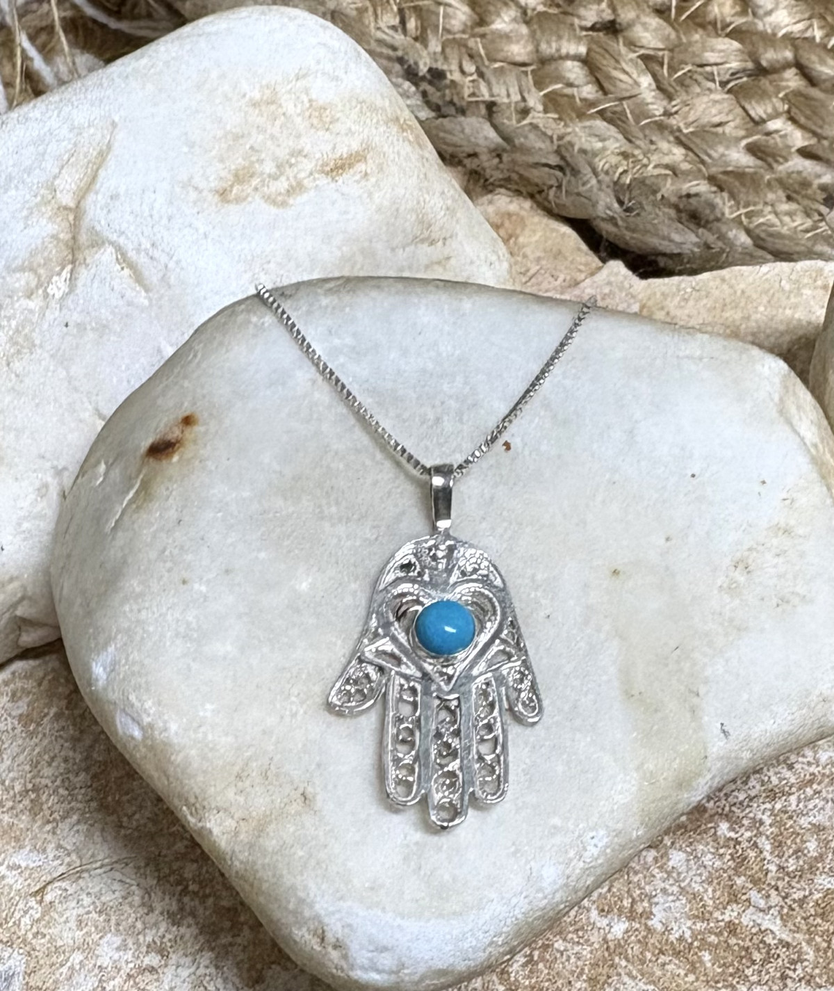 שרשרת כסף 925. עם תליון חמסה בשיבוץ טורקיז עם מסגרת לב.