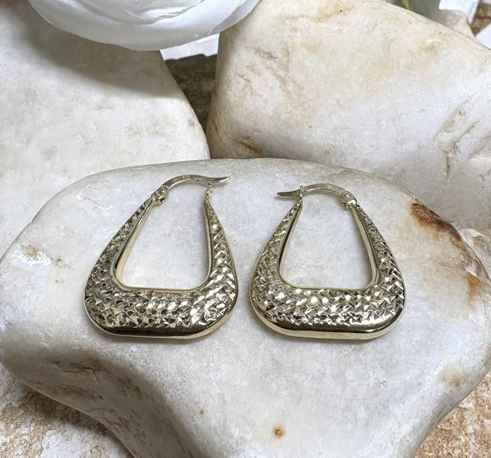 עגילי חישוק זהב 14K בחריטת לייזר. העגילים עם סוגר מנוף.