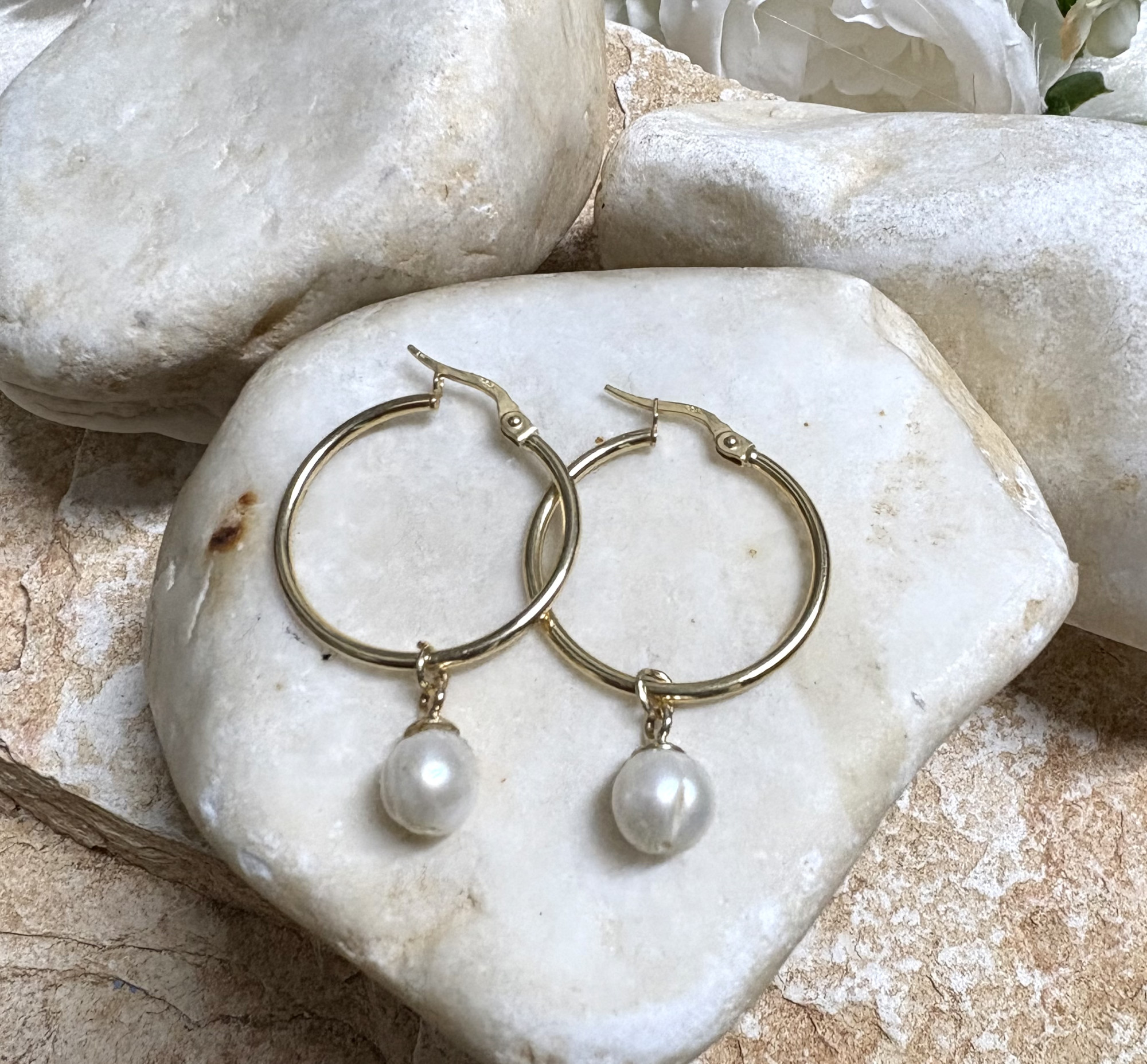 עגילי חישוק זהב 14K עם תליון פנינה נופל.