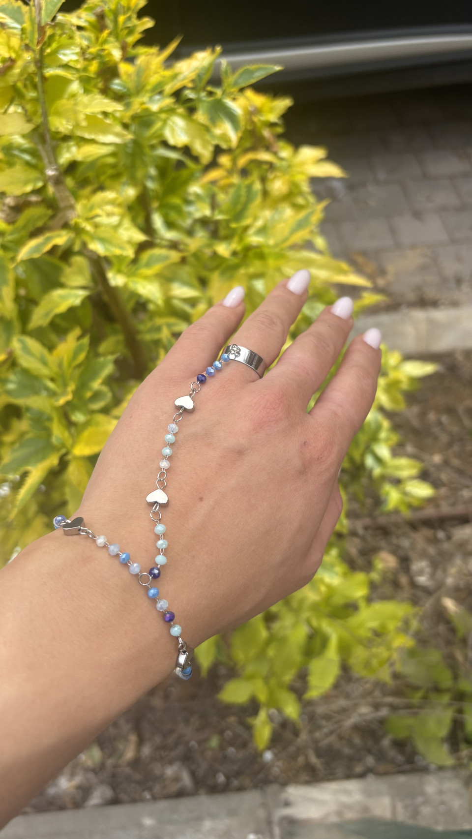 צמיד טבעת בשילוב חרוזים בגווני תכלת-כחול ולבבות.