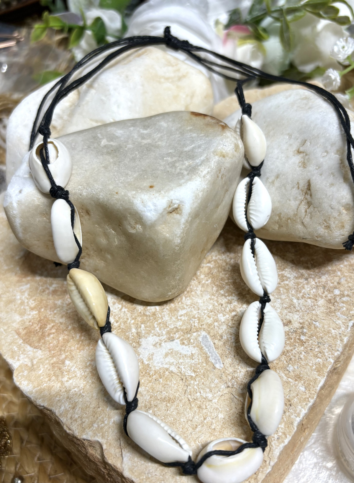 שרשרת חוט עם תליוני קונכיות וצדפים.
