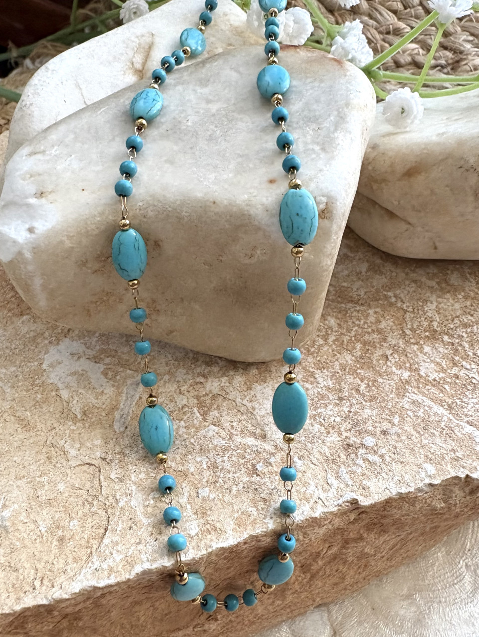 שרשרת עם חרוזי טורקיז בשילוב חרוזים ציפוי זהב.